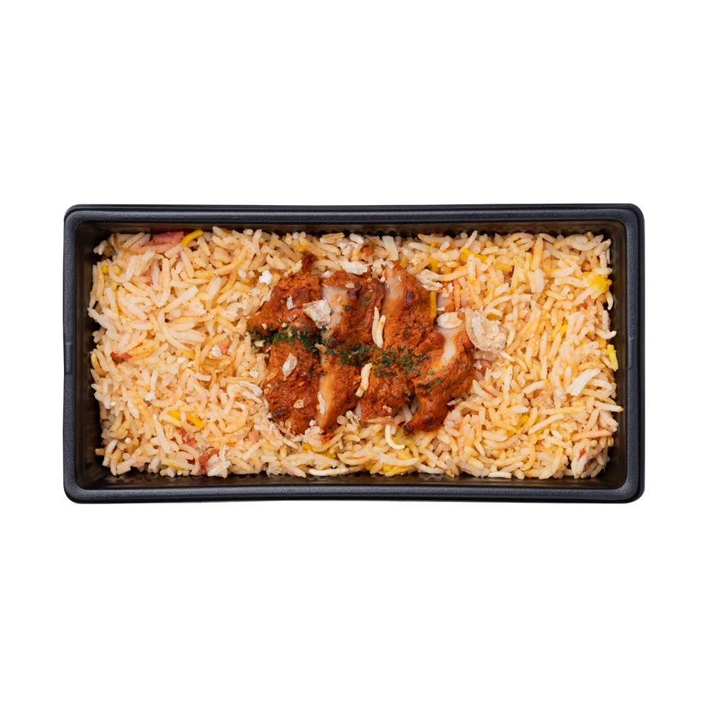 バスマティ米を10種類以上のスパイスで炊き込んだビリヤニと、スパイスマリネの鶏もも肉をオーブンで焼き、柔らかくジューシーに仕上げたシンガポール流にアレンジしたインド料理です。