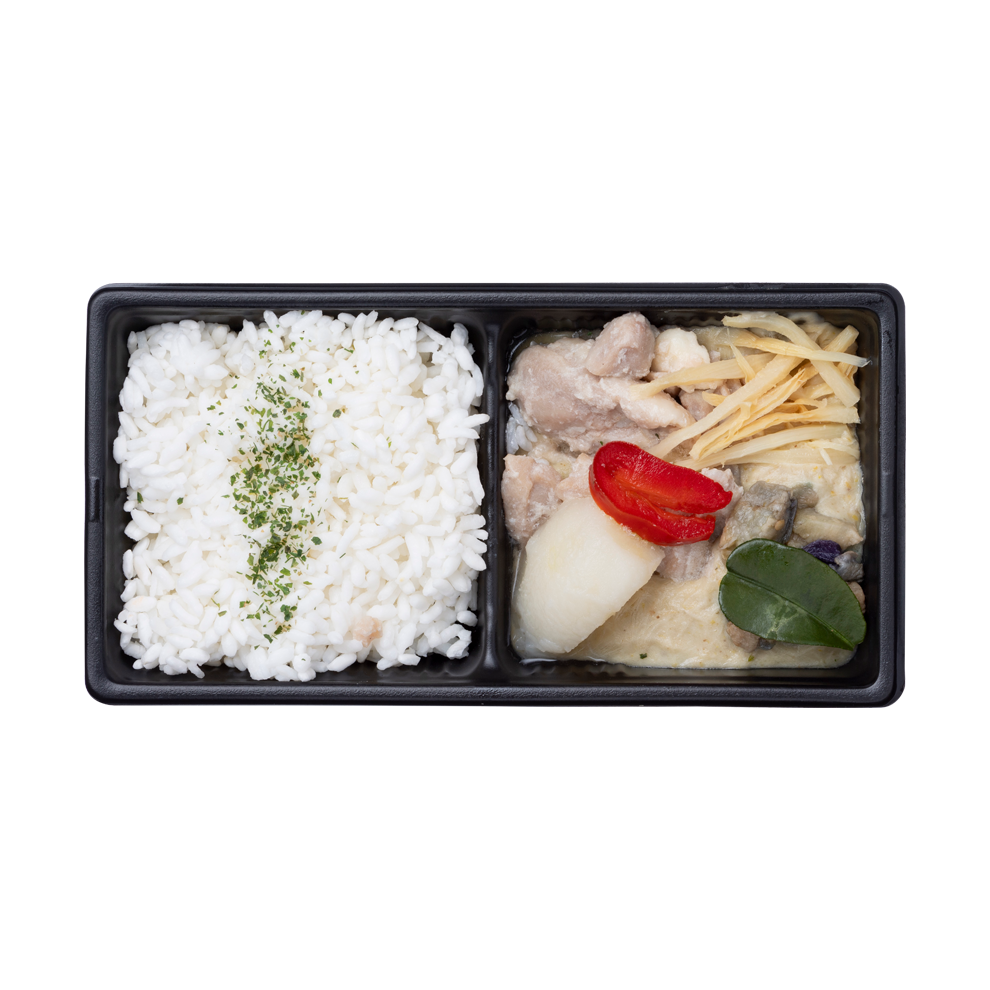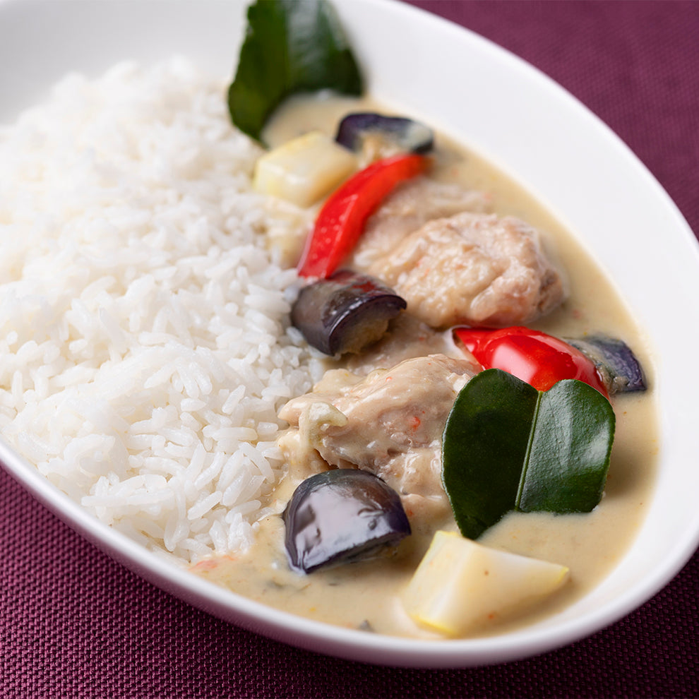 ココナッツミルクと青唐辛子をベースに、タイのスパイスとハーブをふんだんに使用した本格的なカレーです。添えられたバイマックルー(緑の葉)が食欲をそそる香りを演出しています。