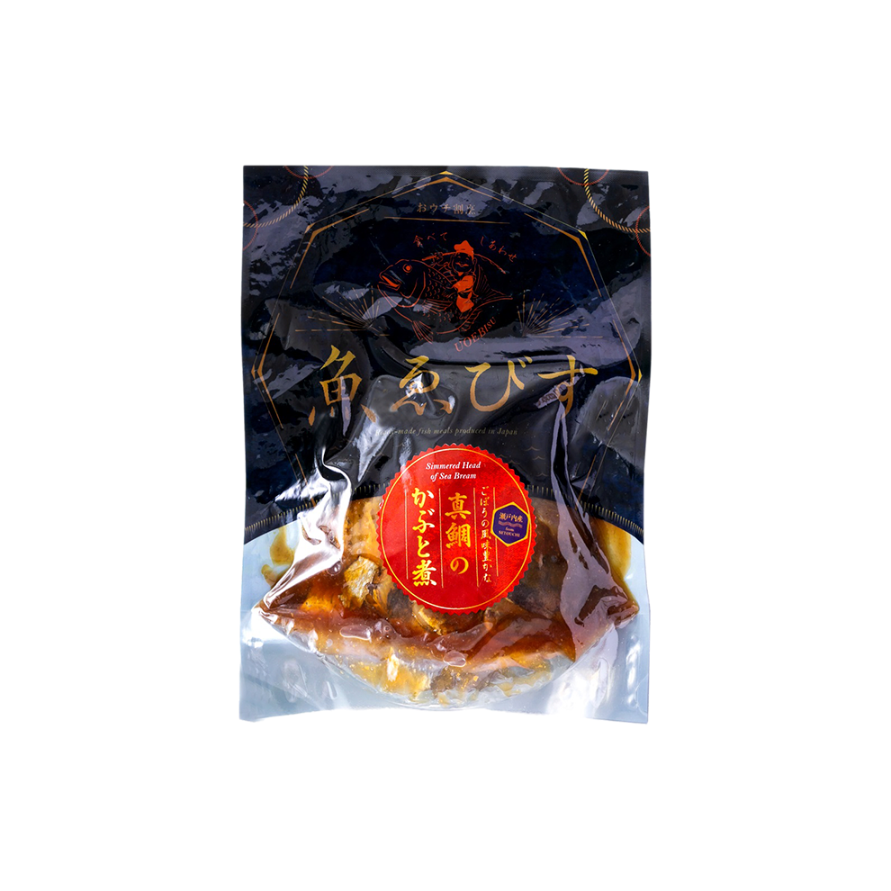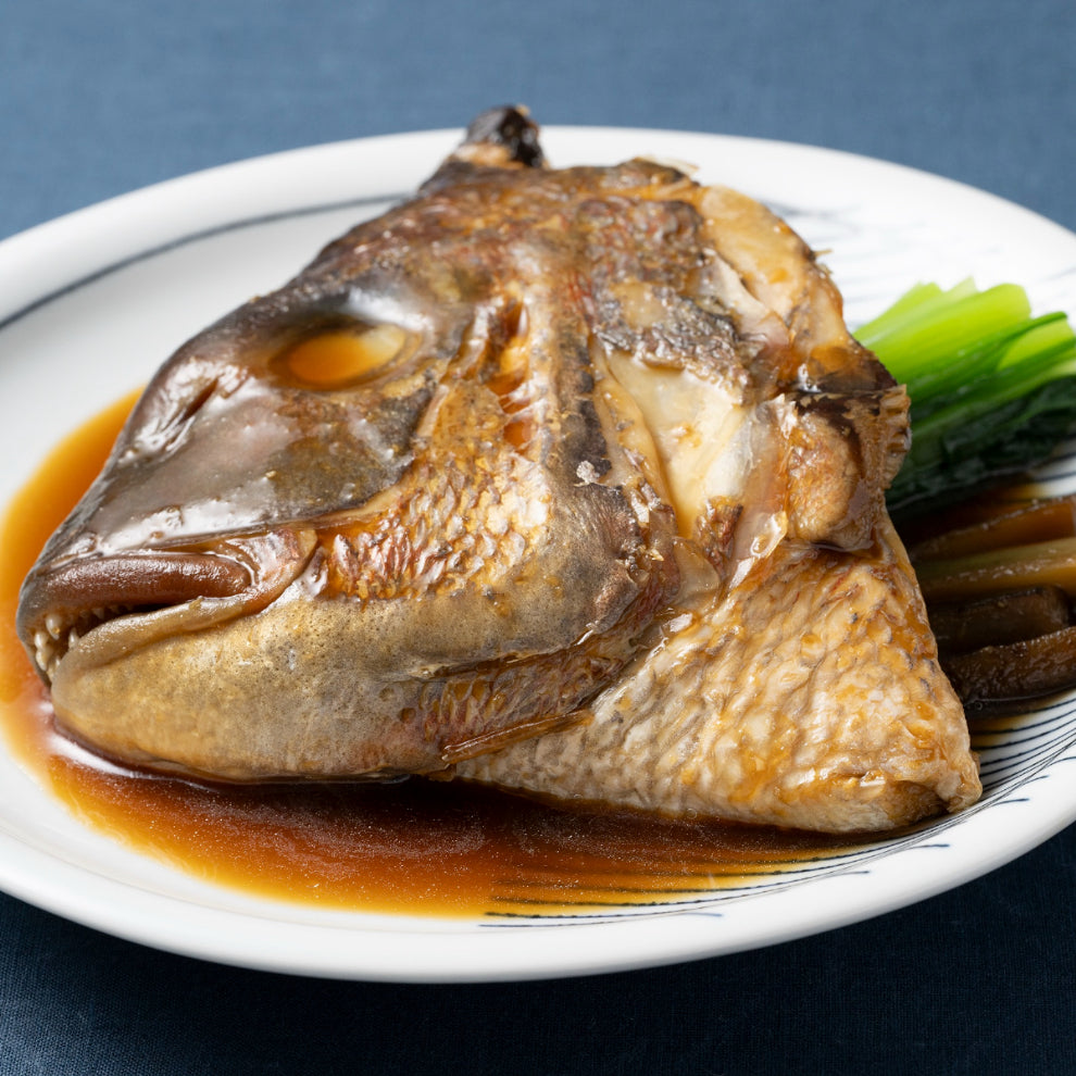 下処理に手間のかかる真鯛のかぶとは、家庭での調理がなかなか難しい食材。国産真鯛のかぶとを使用し、ごぼうと一緒にふっくら炊きあげています。真鯛の骨から出るエキスが煮汁に溶け込み、濃厚なうま味が楽しめます。ふっくら炊き上げた真鯛の身を、煮汁にたっぷり浸してお召しあがりください。