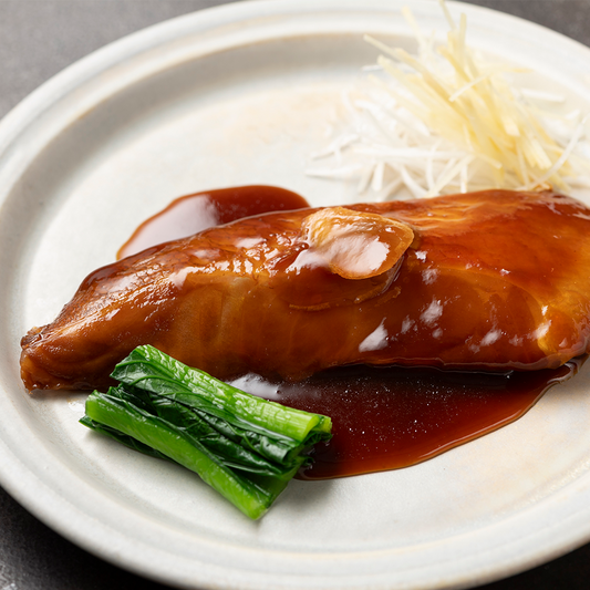 下処理に手間のかかる真鯛のかぶとは、家庭での調理がなかなか難しい食材。国産真鯛のかぶとを使用し、ごぼうと一緒にふっくら炊きあげています。真鯛の骨から出るエキスが煮汁に溶け込み、濃厚なうま味が楽しめます。ふっくら炊き上げた真鯛の身を、煮汁にたっぷり浸してお召しあがりください。