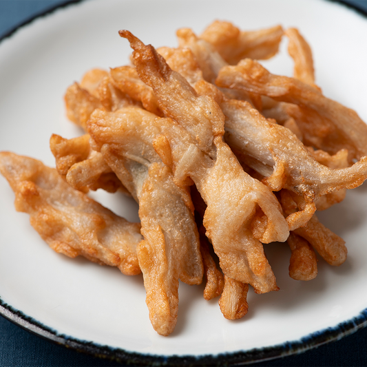 普通のいかげそ揚げと異なり、いかげそを、から揚げ粉を混ぜたすり身で揚げています。いかのうまみをぎゅっと閉じ込め、七味唐辛子を加えることでピリ辛な味わいになっています。