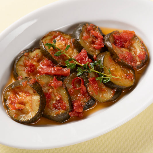 香ばしく焼きあげたズッキーニに、オイル漬けのドライトマトを加え、ガーリック風味のオリーブオイルでマリネしています。ドライトマトの程よい酸味がくせになります。