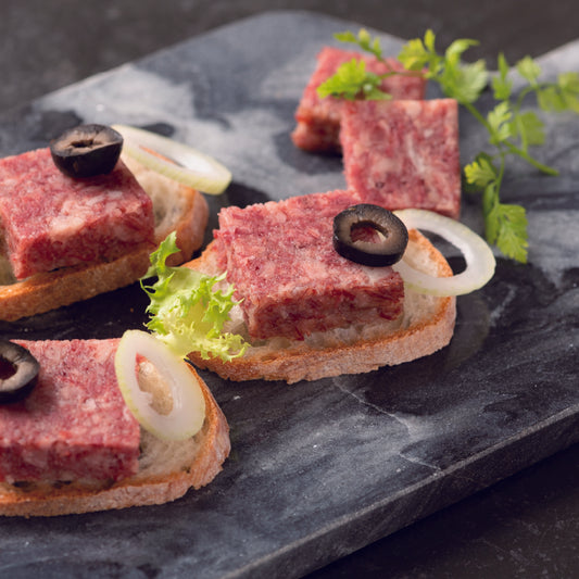 奥出雲和牛を100%使用。肉本来の味わいと食感を楽しめるようシンプルな配合にこだわりました。ソースは、青粒こしょうを使用し、ピリッと濃厚で大人の味わいになっています。